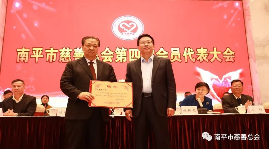 大会选举产生了新一届理事会和监事会。福建圣农集团党委书记、董事长傅光明当选第四届理事会会长,市人大常委会原副主任、一级巡视员翁明亮当选常务副会长,张昌华、杨树权、胡永华、吴解放、黎志生、吴选福、邱为海、雷敏当选副会长,周希梅当选秘书长;吴发胜当选第四届监事会监事长。南平市委书记林瑞良,市政府副市长杨新强为市慈善总会第四届理事会、监事会领导班子颁发了聘书。
